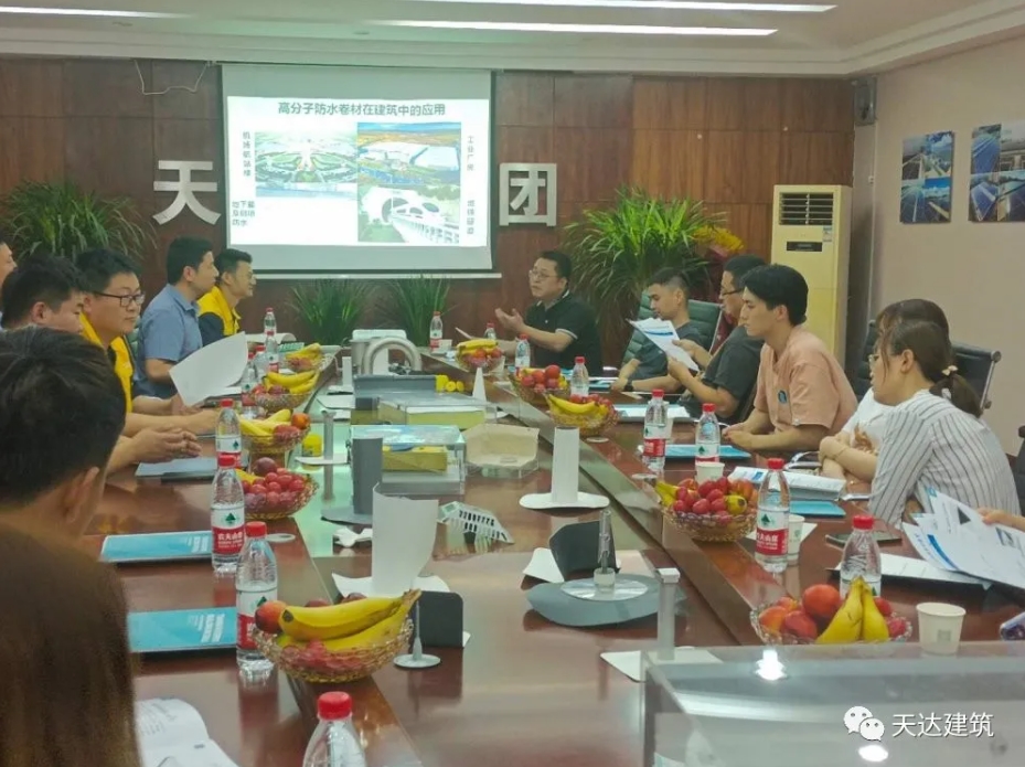 天达西北区销售总负责人郭军峰介绍防水行业发展前景单层屋面系统天达总工岳喜庆介绍单层屋面系统的应用优势,大家对我公司的技术方案和施工水准表示出高度认可!应用领域岳喜庆总工介绍高分子防水卷材应用领域实操交