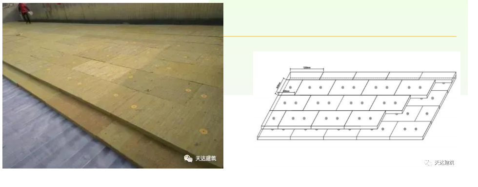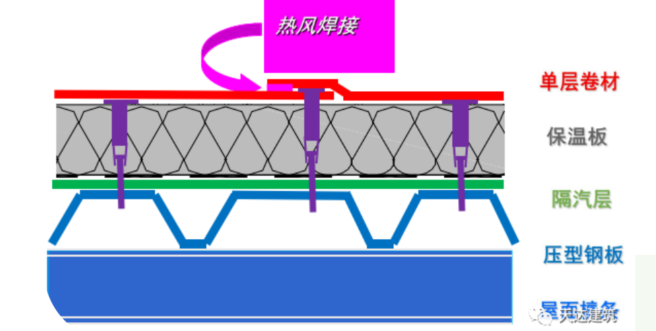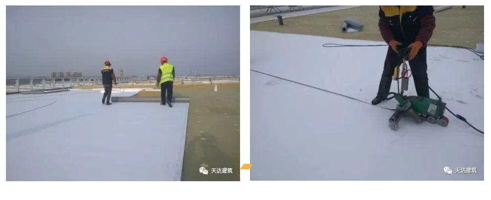 由于厂房屋面结构层为金属板,厂房屋面大面积采用TPO防水卷材能够反射大部分太阳光,有效降低屋面传热,且与传统压型钢板复合保温自防水系统相比,防水效果更加突出,适用于大跨度建筑的屋面围护。 屋面施工要点 隔气层施工 按照规范要求在基层表面铺设隔汽层,左右两道PE膜的搭接宽度为10 cm,搭接方向为顺水搭接,采用专用的丁基胶带进行粘接密封,然后用压辊压实,使上下两幅PE膜粘接牢固。 保温层施工 岩棉保温板安装时,上下左右错缝铺设,搭接紧密、平整,防止通缝,并用专用固定件固定,确保保温板有足够受力面积,减少对保温板的破坏。岩棉保温板安装与覆盖应同步进行,防止沾水受潮。 防水层施工 1)卷材铺设:首先进行预铺,把自然松弛的TPO防水卷材按轮廓线铺在基层上,平整顺直、不得扭曲,并进行适当的剪裁。卷材的铺设方向应垂直于压型钢板长边方向;平行于屋脊的搭接缝应顺流水方向搭接,垂直于屋脊的搭接缝应顺年最大频率风向搭接。 2)卷材搭接:卷材的纵向搭接宽度≥120 mm,可根据情况进行点式固定或线式固定。点式固定按照设计间距,用专用工具将固定件旋进压型钢板波峰,穿透钢板25 mm;线式固定将金属压条合理排列,用电动螺丝刀将固定件直接旋进压型钢板波峰处,穿透钢板25 mm。 3)卷材焊接:卷材所有搭接均采用热风焊接。焊接前擦净焊接处,无水点、油污及附着物;焊接时测试焊接温度、焊机速度、吹风量,焊接后检测焊缝质量。当天铺设的卷材尽量当日完成焊接;对于每日施工后留下的接口,应进行保护,避免淋雨和受潮。 天达防水建材有限公司参与施工的中航工业某航空工业园厂房屋面就是采用的TPO单层屋面系统,在屋面系统设计与施工中,充分考虑各项因素,规范施工流程,同时灵活处理细部节点及施工难点,打造了不漏的精品工程。项目完工至今已有3年,防水与保温效果良好,获得了“2020年度建筑防水行业科学技术奖-工程技术奖(金禹奖)”银奖荣誉。