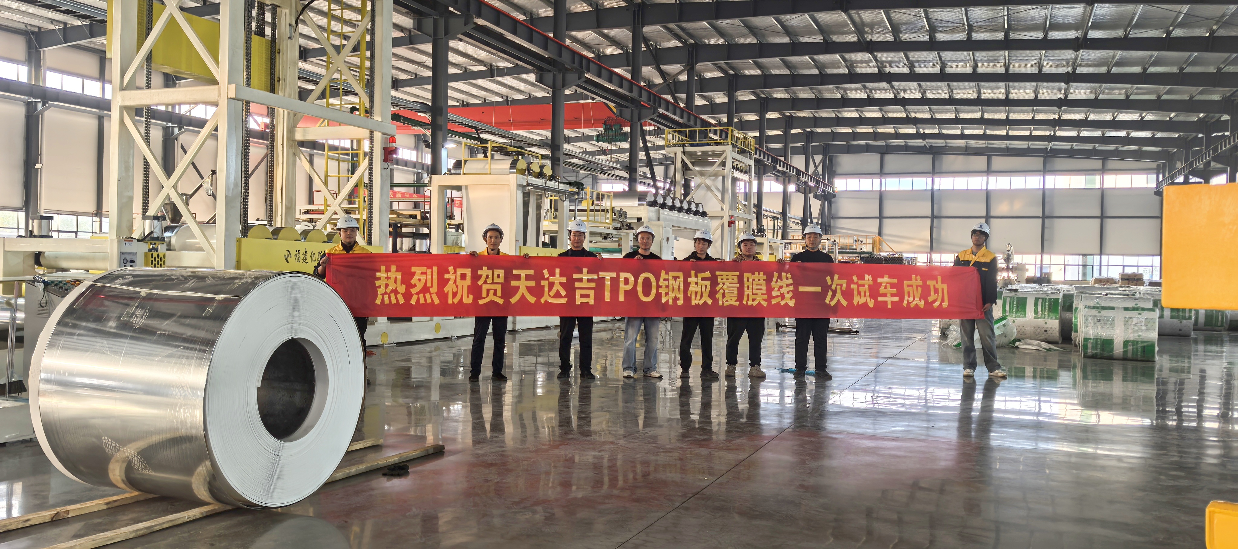 热烈祝贺天达防水TPO钢板覆膜线一次试车成功!